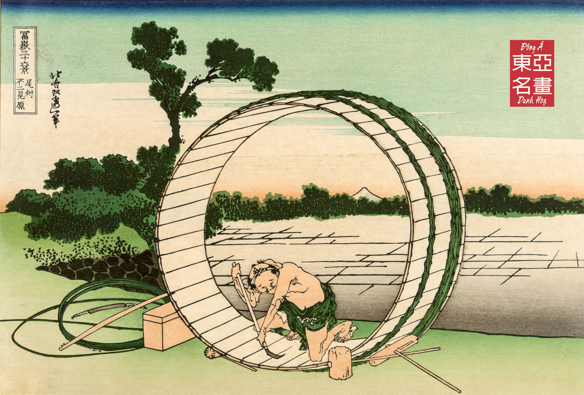“Núi Phú Sĩ Nhìn Từ Cánh Đồng Owari” vẽ một người thợ đang ngồi gia công trong một vòng gỗ lớn. Những vòng tre tròn dẹt ẩn ý quá trình và cấu trúc đang được người thợ làm dang dở. Đó có thể là một chiếc thúng lớn hoặc một chiếc thùng rỗng đáy. Người thợ làm việc tập trung và chăm chú. Các vật dụng rải rác nằm cạnh bên. Nhìn xuyên qua vòng gỗ là cảnh cánh đồng trải dài đến gần núi Phú Sỹ (theo Trung Tâm nghiên cứu quốc tế về Nhật Bản, 2005-2006).